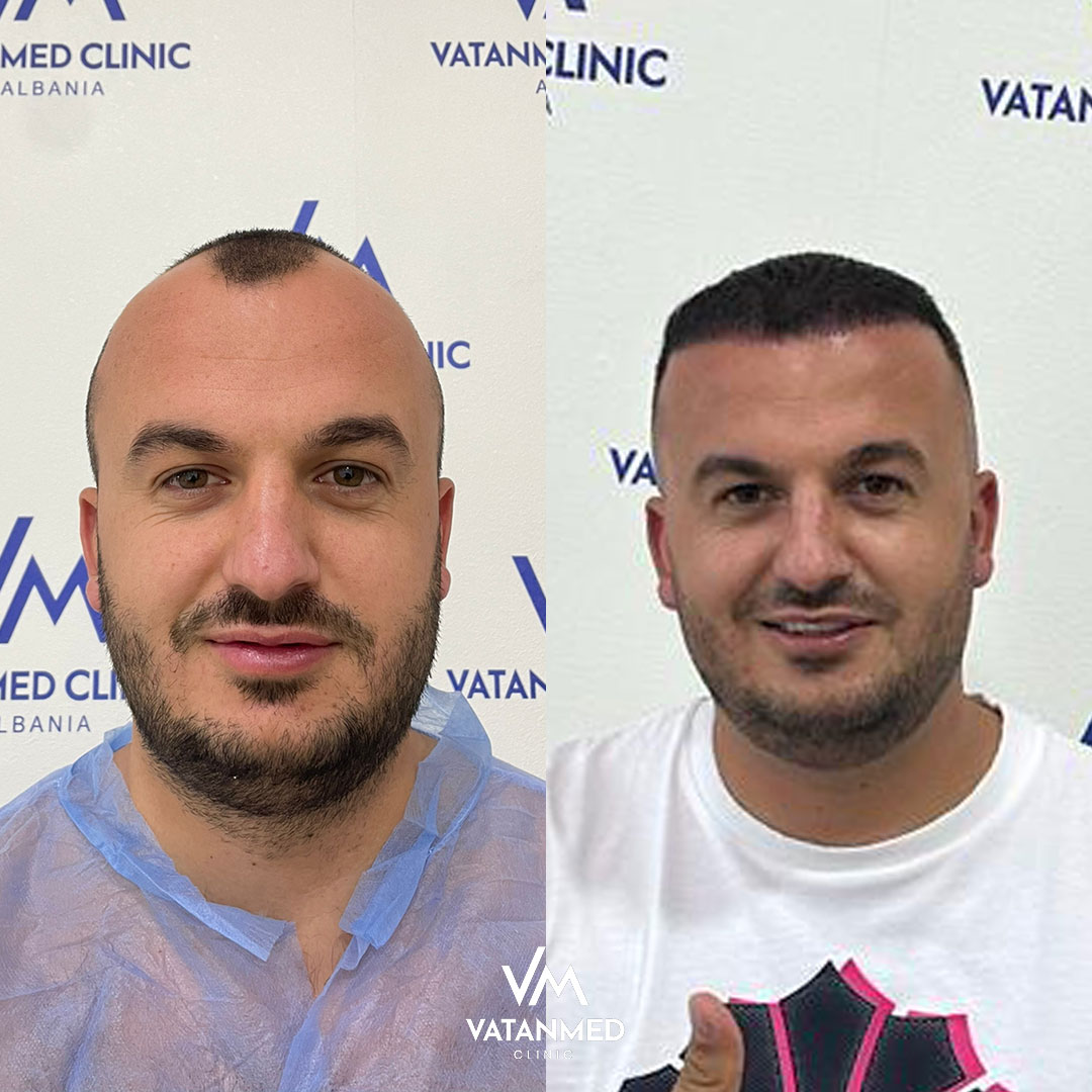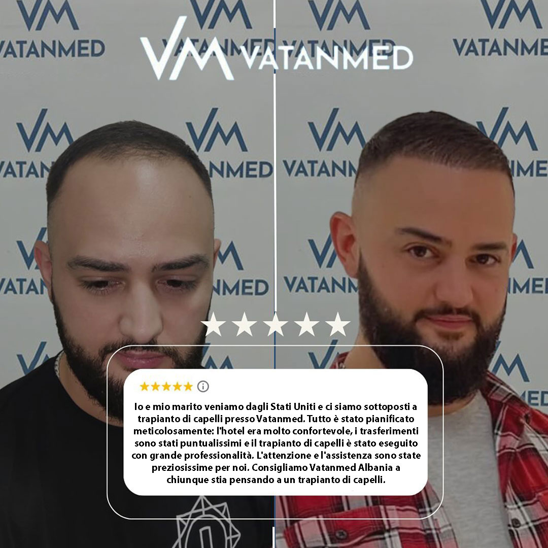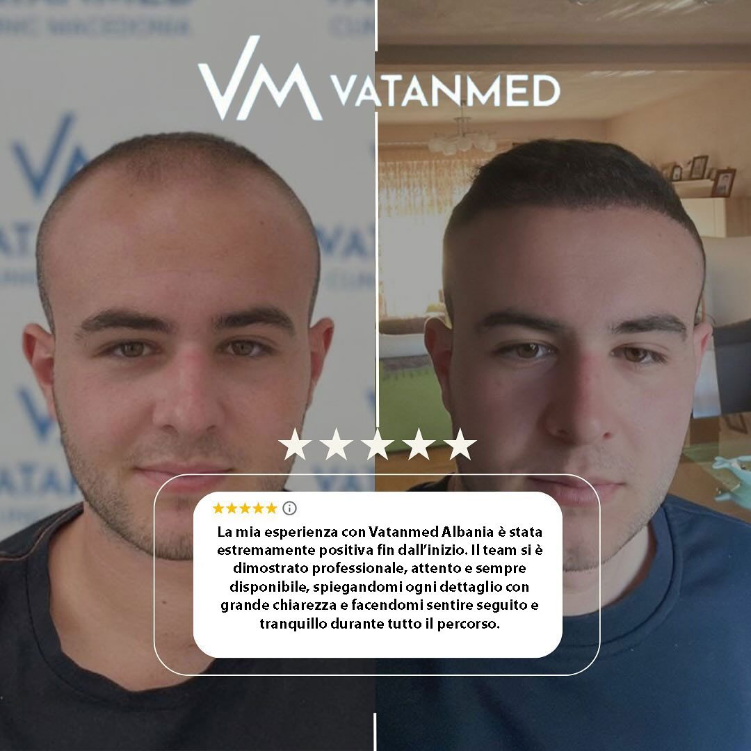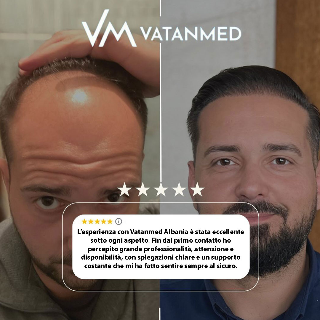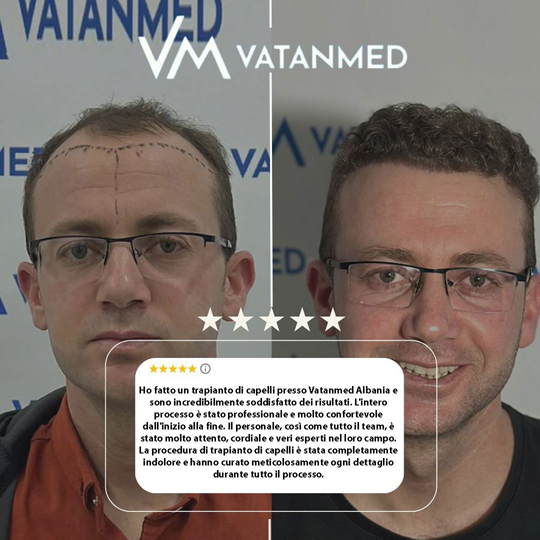 Entro poche settimane dalla procedura i pazienti possono sperimentare una leggera caduta dei capelli e sensazioni al cuoio capelluto, che scompaiono gradualmente, e al loro posto inizia a crescere un nuovo capello, resistente. La maggior parte delle persone torna al lavoro entro 2–3 giorni. Con oltre il 98% di livello di soddisfazione e risultati progettati per durare tutta la vita, le procedure di trapianto di capelli presso la clinica Vatanmed in Albania sono preferite da pazienti da tutto il mondo.